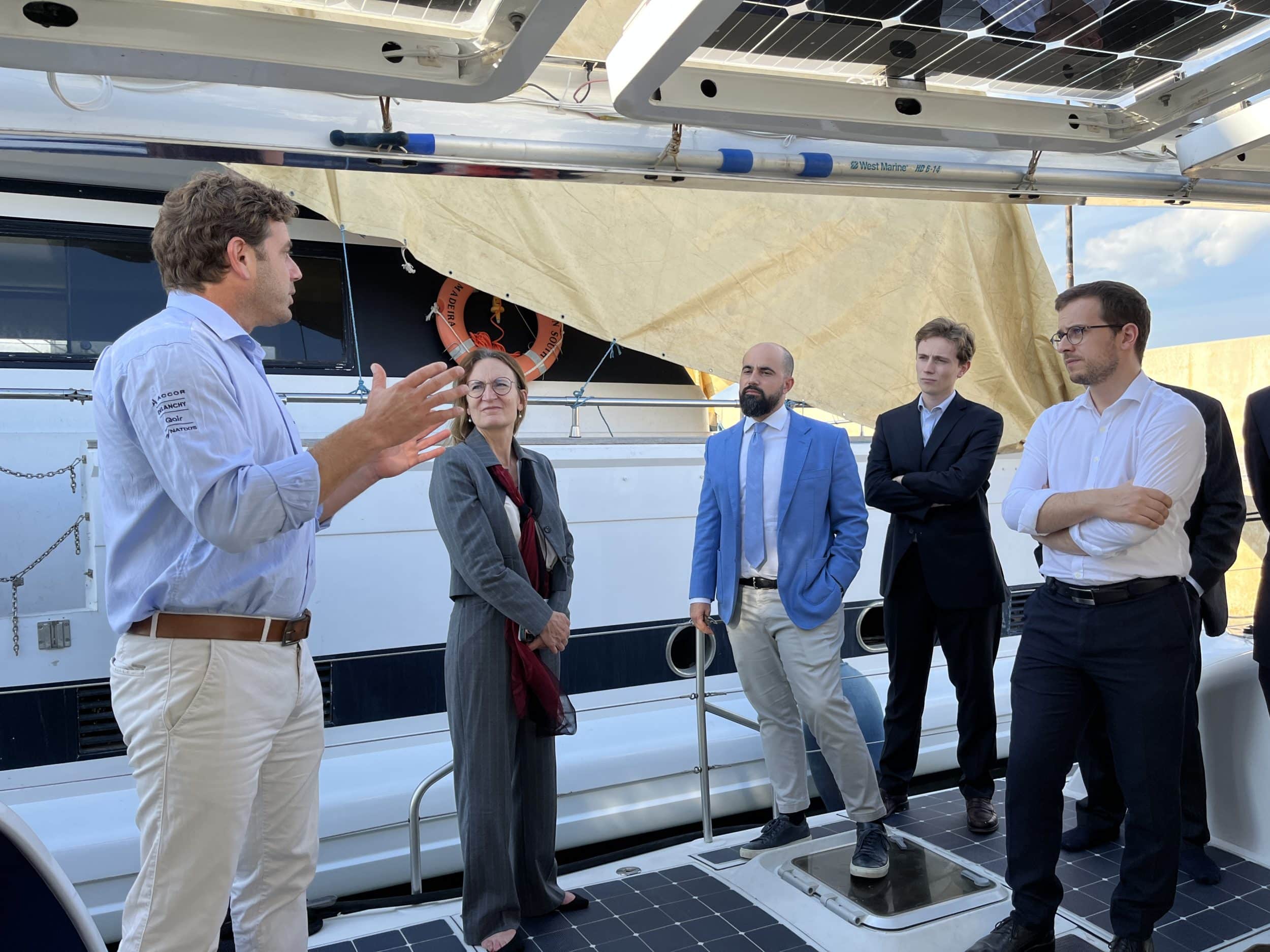 Marin Jarry, Capitaine du bateau, présente les technologies embarquées sur Energy Observer à Anne Gueguen, l’Ambassadrice de France en Tunisie.